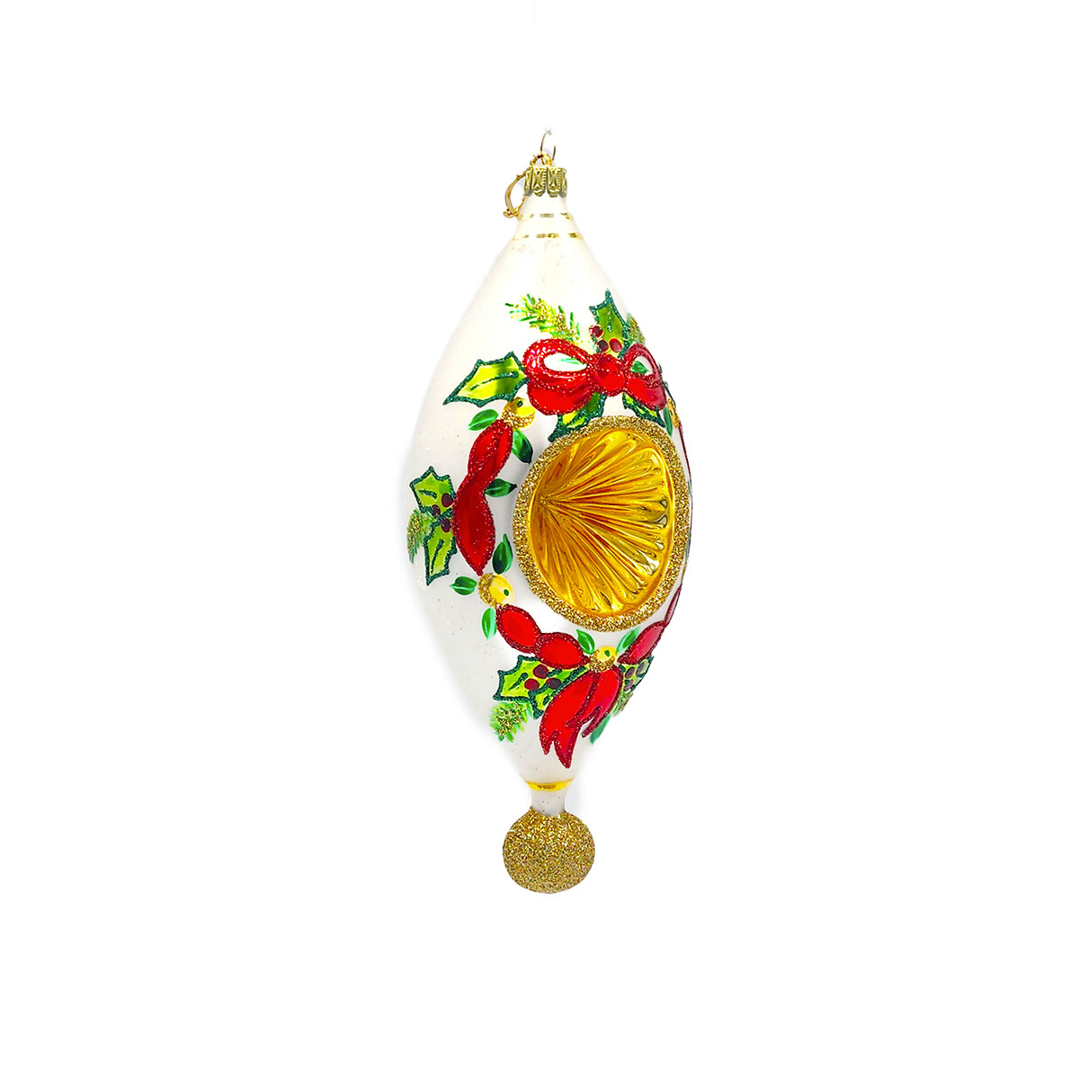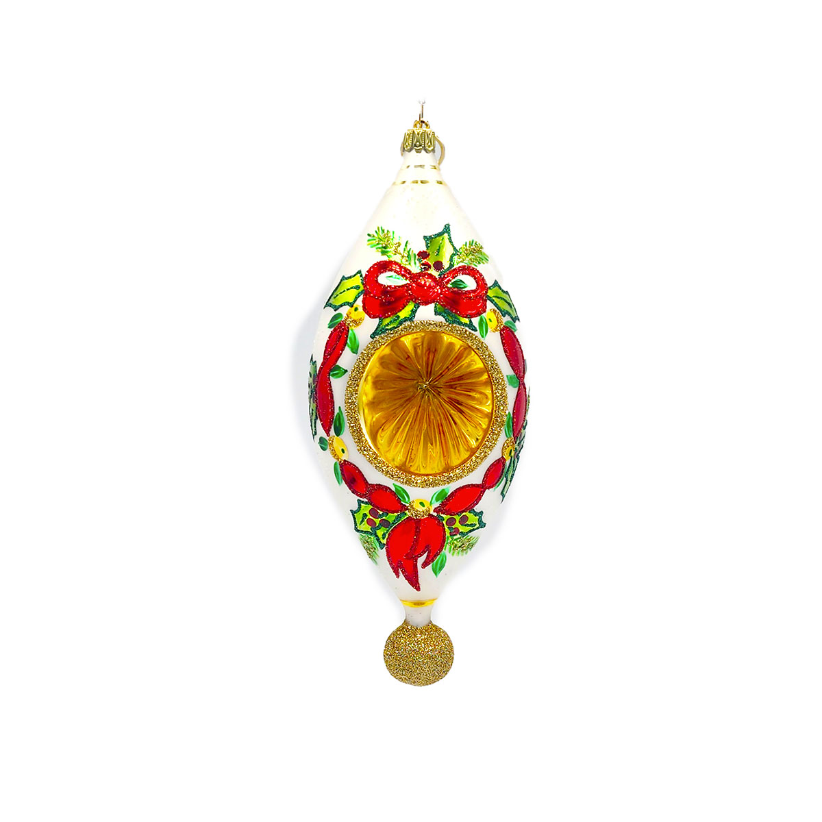 Celebrate the season with this stunning European glass ornament featuring a radiant gold reflector framed by holly, ribbons, fruits and berries. Perfect for collectors or as a standout heirloom piece, this ornament celebrates traditional craftsmanship with timeless holiday spirit. Measures 7.5″