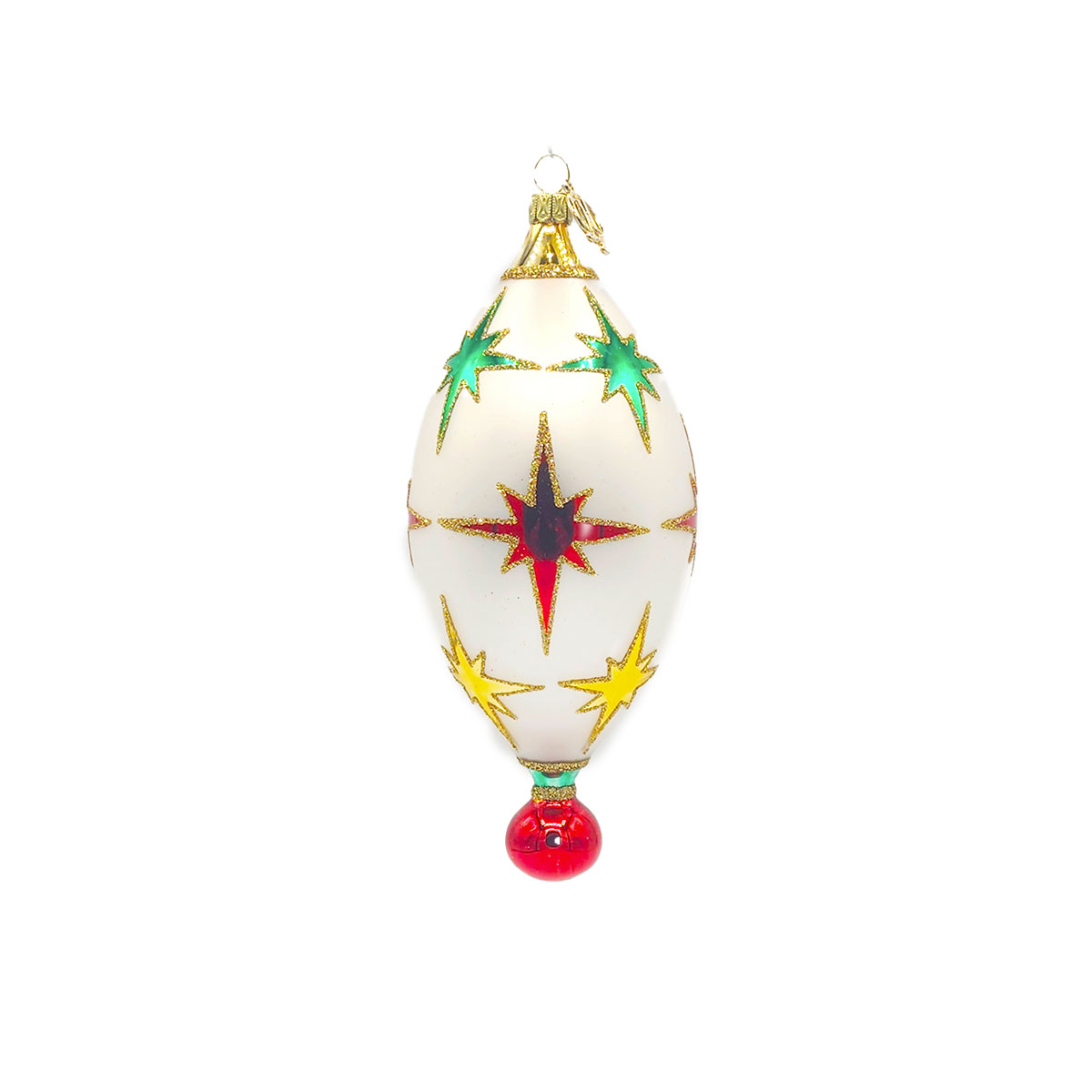 Measures 7.5″Blast off into retro holiday magic with this handcrafted European glass ornament bursting with colorful atomic starbursts and vintage mid-century flair. A stellar addition to any Christmas tree or collection! Measures 7.5″